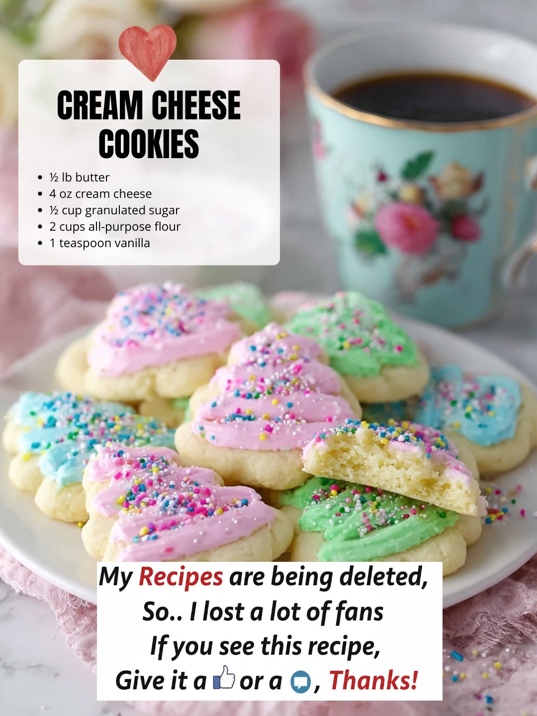 These cream cheese cookies are ultra-soft, buttery, and melt in your mouth. Made with simple pantry ingredients, they’re perfect for holidays, birthdays, or anytime you want a sweet, bakery-style treat. The light cream cheese frosting and colorful sprinkles make them irresistible!