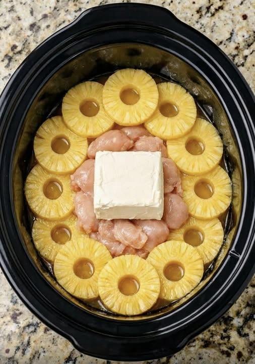 Lay pineapple slices or chunks around and over the chicken. - Add Cream Cheese