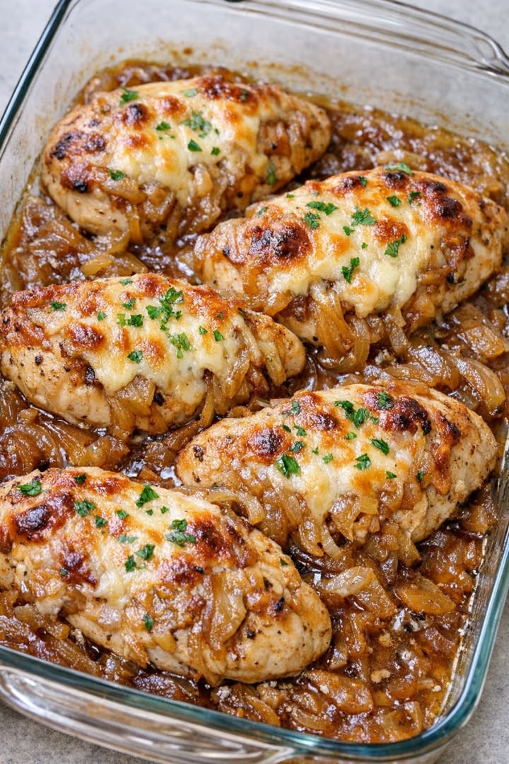 This easy baked chicken recipe is perfect for busy weeknights but elegant enough for guests. With tender chicken, rich onion gravy, and bubbly cheese, every bite is packed with flavor.